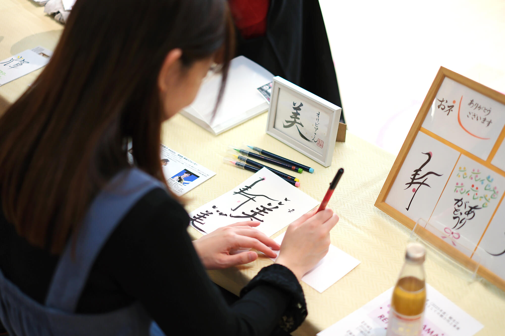 また、プロならではの添削・アドバイスを通じて、参加者自身の“クセ”がその場で改善されていく実感があり、日本の美意識に触れながら、自分だけの美文字作品を完成させてお持ち帰りいただけます。