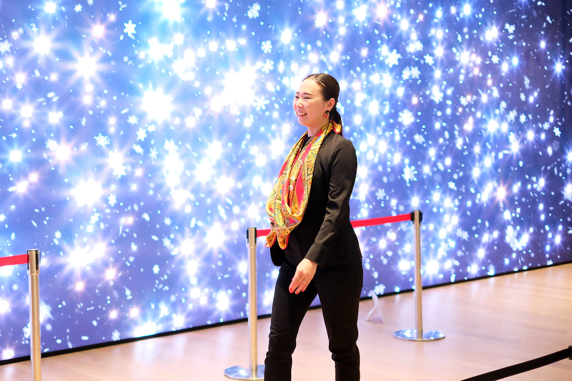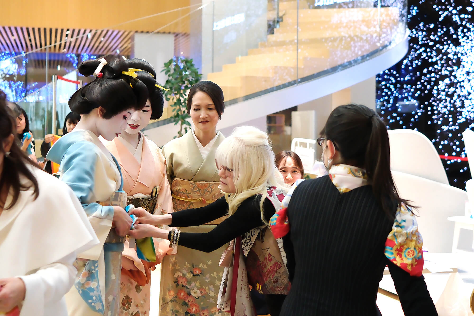 レッスンの締めくくりには、資生堂ビューティーパークの象徴的な階段を背景に、凛とした姿勢と美しいシルクをまとった特別な記念撮影もお楽しみいただけます。