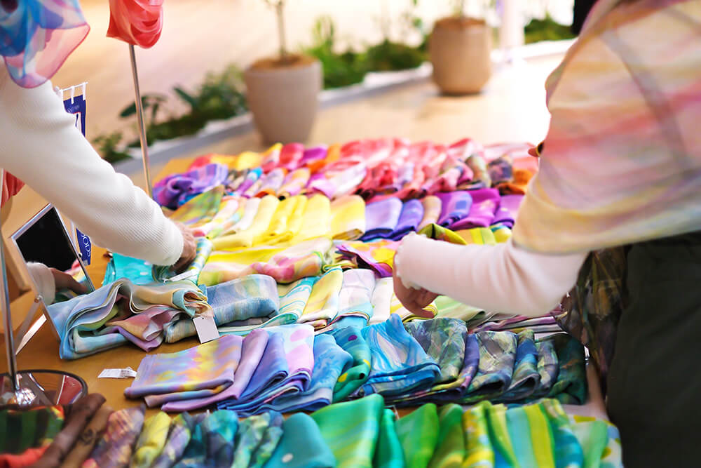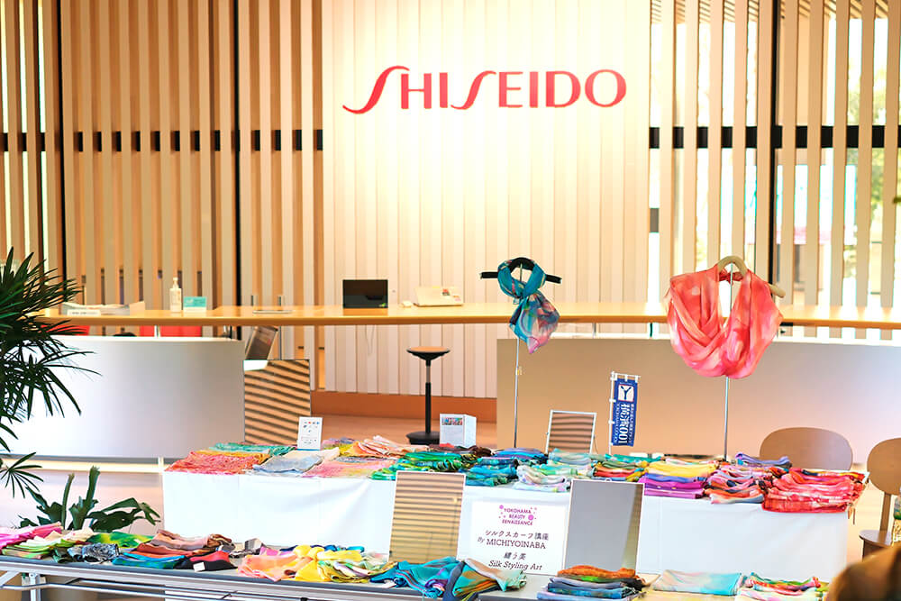 本講座では、そんな横浜シルクの物語を背景に、テキスタイルアーティストMICHIYO INABA が手がける上質なシルクスカーフやチーフを使い、シルクが持つ美しい艶と流れるようなドレープを引き出す“身にまとうアート”としての着こなしを体験していただきます。