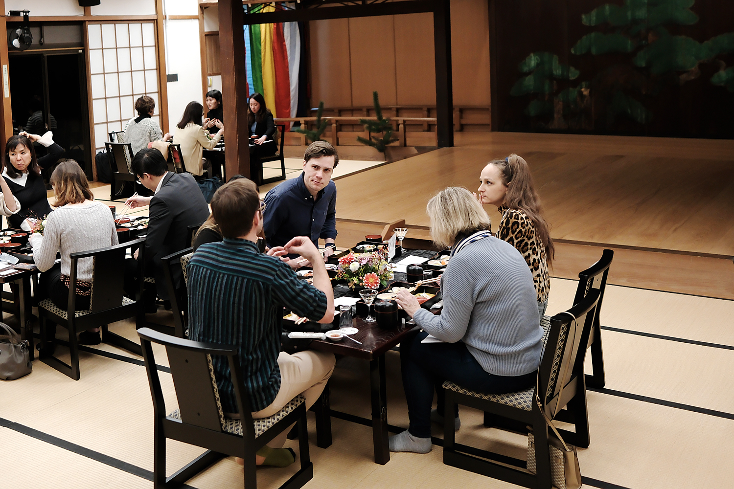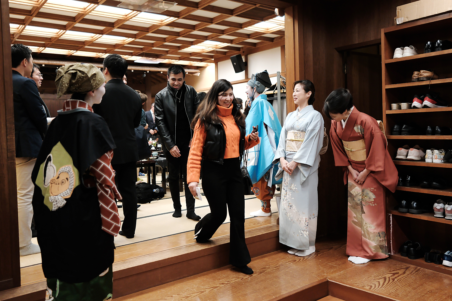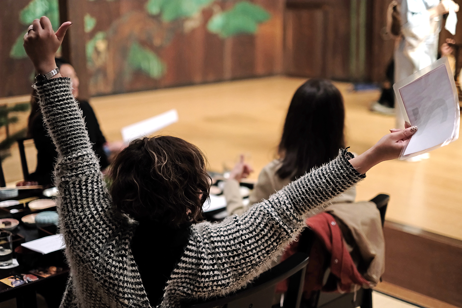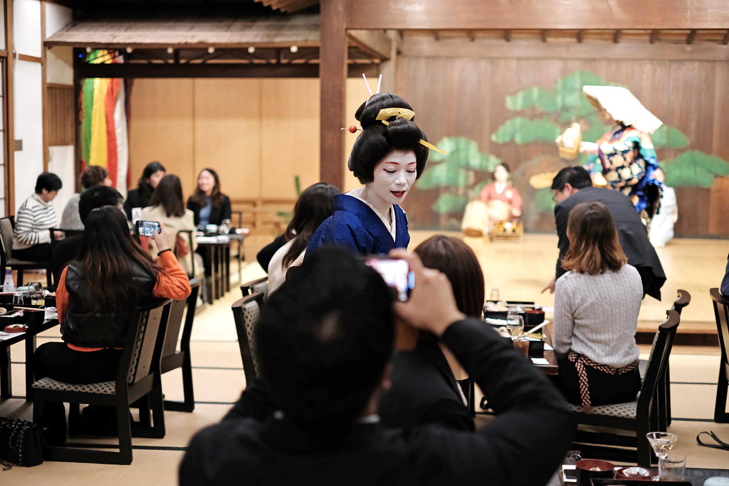 舞台から降りてくる横浜芸者と直接お話しできる時間を設けました。芸者との距離感がグッと近まり、熱心にお話しされる方や名刺交換される方、記念撮影される方など、皆さん思い思いの時間を過ごされています。